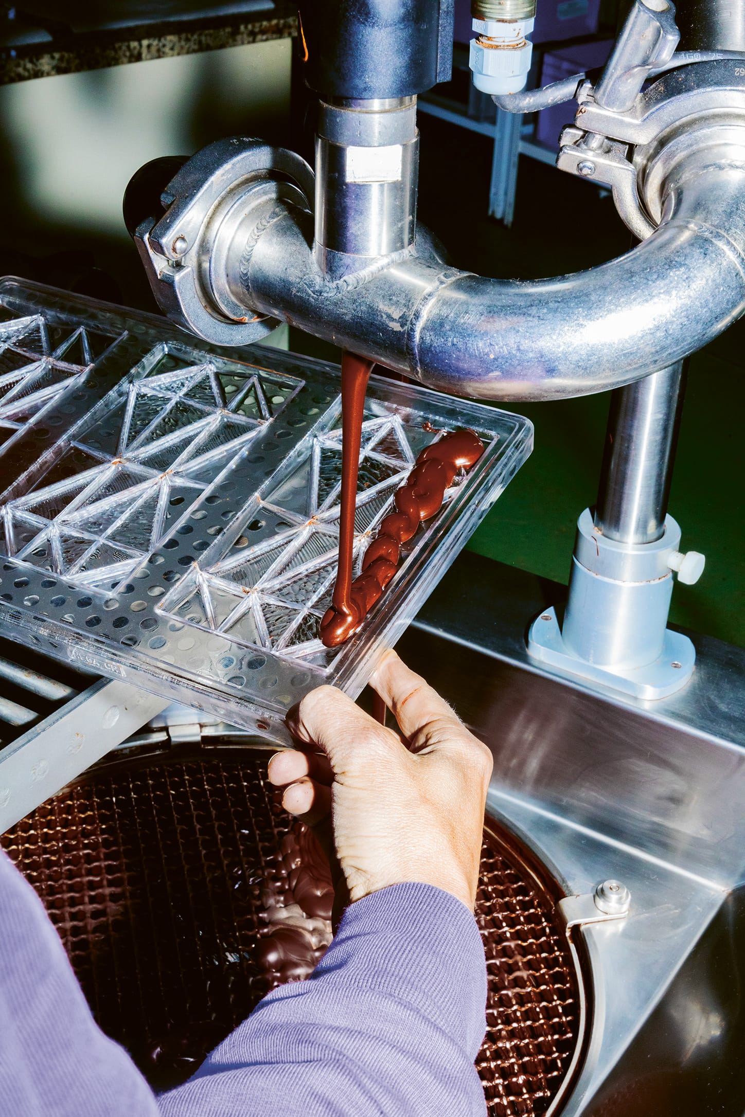 In jedem Produktionsschritt gibt es Gestaltungsspielraum, was für Lukas Bosshart von der Manufaktur Taucherli wichtig ist: «Der grösste Reiz liegt für uns darin, Qualität und Nachhaltigkeit in jedem einzelnen Schritt aktiv zu gestalten. Gleichzeitig ist die Bean-to-Bar-Produktion für uns eine Spielwiese der Innovation.» Die Produktpalette weiterzuentwickeln, neue Aromen herauszukristallisieren und mit Kakao zu experimentieren, ist für alle Verantwortlichen zentral. Jedes Röstverfahren stimmt Taucherli auf die Ernte ab. Der Conchierprozess – das feine Mahlen und Rühren der Kakao-Zucker-Mischung – kann je nach Bohnensorte zwischen 70 und 120 Stunden dauern.